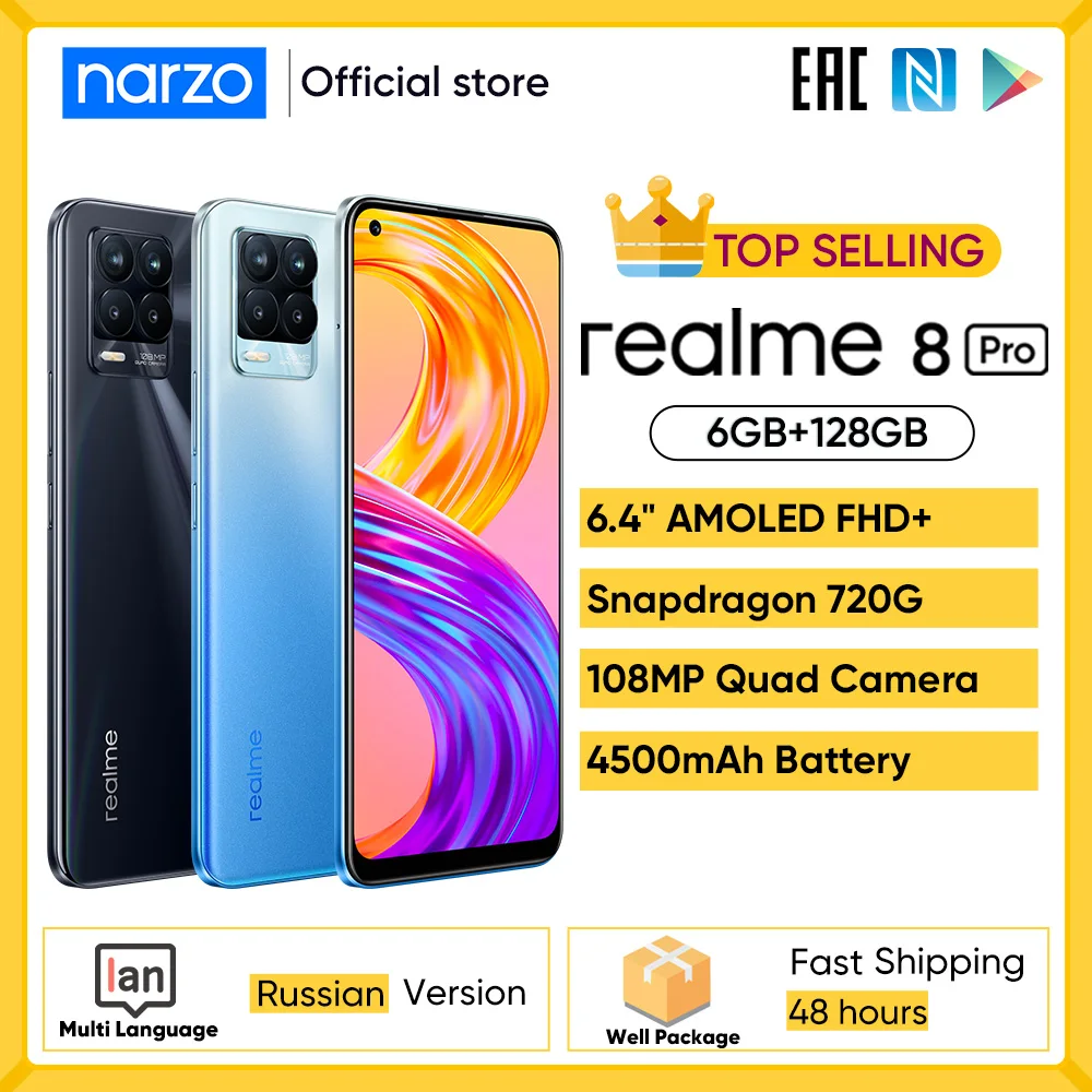 Top Russian Version realme 8 Pro 108MP Camera Snapdragon 720G Smartphone 6.4'' Display AMOLED 50W Super Dart Charge 4500mAh Battery